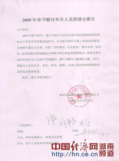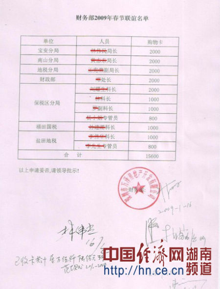 在另一份有萬澤地產(chǎn)林偉光董事長簽字并加蓋公章的2009年春節(jié)聯(lián)誼單上顯示,收受禮品的官員分別有寶安分局林某某局長、南山分局黃某某局長、地稅分局王某某副局長、財政部鄧處長、保稅區(qū)分局劉某某科長,均收禮2000元,保稅區(qū)分局林科長、羅副科長、福田國稅孫某某科長、鹽田地稅李某某科長,均收禮1000元,保稅區(qū)分局楊小姐專管員、鹽田地稅李先生專管員,均收禮800元。