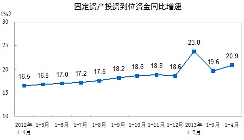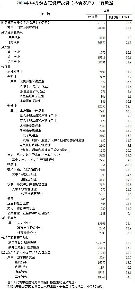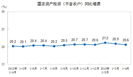 2013年1-4月份,全國(guó)固定資產(chǎn)投資(不含農(nóng)戶)91319億元,同比名義增長(zhǎng)20.6%,增速比1-3月份回落0.3個(gè)百分點(diǎn)。從環(huán)比看,4月份固定資產(chǎn)投資(不含農(nóng)戶)增長(zhǎng)1.63%。