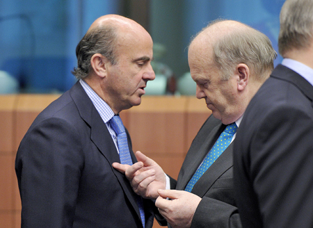 西班牙經(jīng)濟(jì)與競(jìng)爭(zhēng)力部長(zhǎng)路易斯·德金多斯(左)13日在歐盟總部與愛爾蘭財(cái)長(zhǎng)邁克爾·努南交談。當(dāng)日,歐元區(qū)財(cái)長(zhǎng)會(huì)在布魯塞爾舉行,會(huì)議將批準(zhǔn)對(duì)希臘和葡萄牙的最新一筆救助資金,希臘將獲得約75億歐元,葡萄牙將獲得20億歐元。