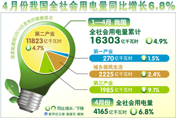 國(guó)家能源局14日公布的數(shù)據(jù)顯示,4月份我國(guó)全社會(huì)用電量4165億千瓦時(shí),同比增長(zhǎng)6.8%。分產(chǎn)業(yè)來(lái)看,第二產(chǎn)業(yè)用電量同比增長(zhǎng)7.63%,與3月份相比回升4.74個(gè)百分點(diǎn),而其他產(chǎn)業(yè)的用電量情況也均好轉(zhuǎn),增幅實(shí)現(xiàn)“由負(fù)轉(zhuǎn)正”。其中,第一產(chǎn)量用電的回升幅度最大,達(dá)到14.34個(gè)百分點(diǎn),而第三產(chǎn)業(yè)用電量同比增幅和城鄉(xiāng)居民生活用電量同比增幅則分別增長(zhǎng)了9.26個(gè)百分點(diǎn)和0.13個(gè)百分點(diǎn),至8.9%和0.02%。