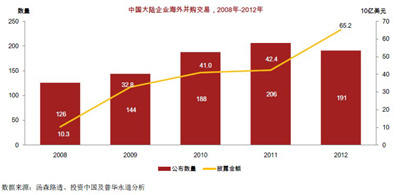 在數(shù)量方面,普華永道數(shù)據(jù)顯示,中國企業(yè)在過去5年中的海外并購數(shù)量分別為126起、144起、188起、206起和191起,一直保持在數(shù)量較大、增長較快的水平;而在金額方面,中海企業(yè)海外并購的總金額從2008年的103億美元迅速增長至2012年的652億美元,五年間增加五倍有余。另外,中國自2009年以來已占據(jù)五大新興市場中的領(lǐng)先地位,2012年中國的占比達(dá)到歷史新高,就交易金額而言,近70%新興市場對成熟市場的投資來自于中國。