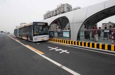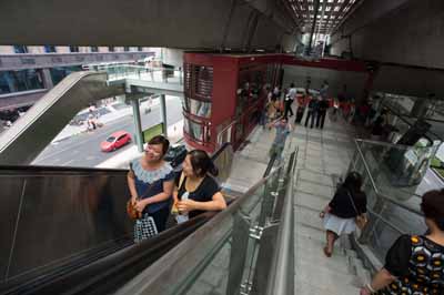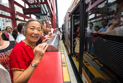 快速公交開通首日,市民坐電梯進(jìn)站乘車。