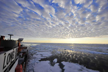 霧:霧是東北航道海上能見度低的主要原因。東北航道的海霧主要有平流霧、輻射霧和蒸汽霧三大類。航行中最常見的霧是平流霧,常出現(xiàn)于有層云的陰天,并隨風(fēng)飄移,向下風(fēng)方向擴(kuò)展。平流霧可發(fā)生于一天中的任何時(shí)間,也可能在任何時(shí)間消散,濃度大、厚度大、水平范圍廣、持續(xù)時(shí)間長(zhǎng)。東西伯利亞海和楚科奇海的霧天較多,能見度最差時(shí)不到0.5海里。