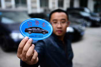青海省某單位一名駕駛員在展示領(lǐng)取的公務(wù)用車標(biāo)識。記者 張宏祥/攝 |