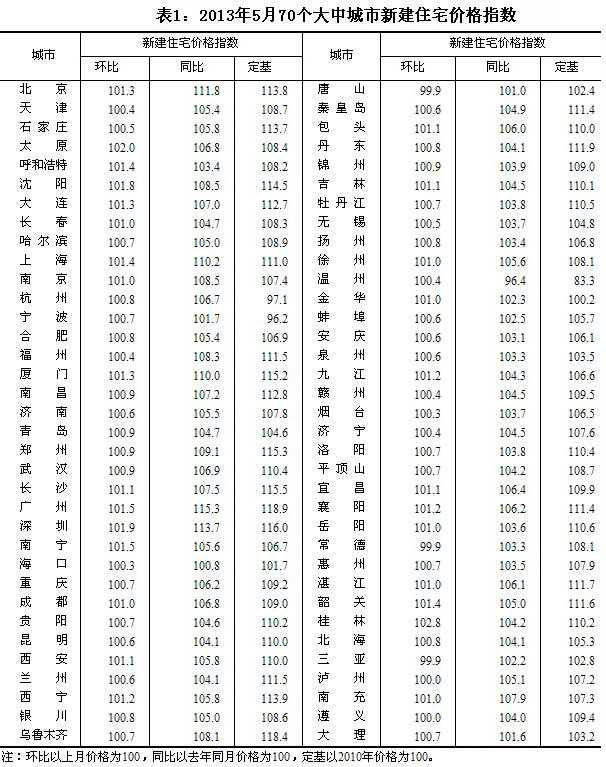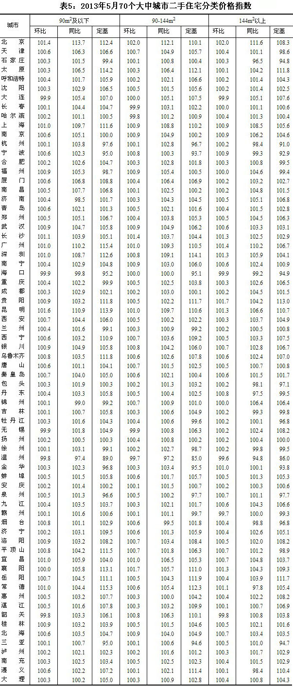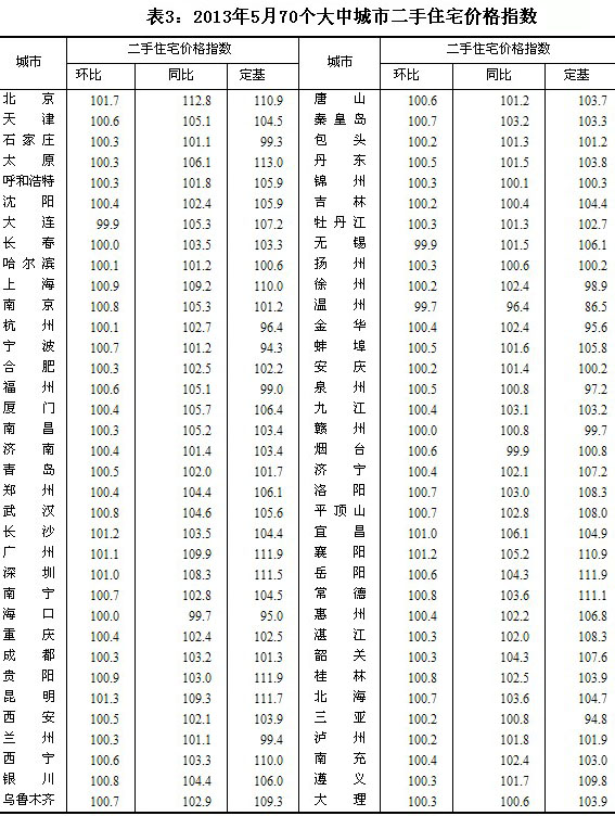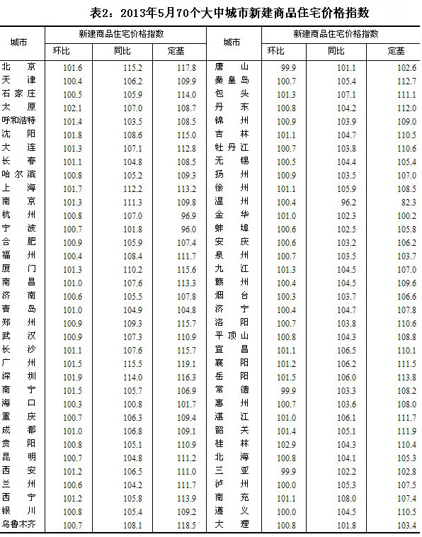 (二)與去年同月相比,70個大中城市中,價格下降的城市有3個,上漲的城市有67個。5月份,同比價格上漲的城市中,漲幅最高為12.8%,漲幅比4月份回落的城市有5個。