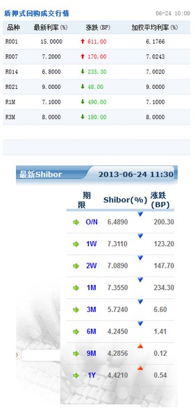 但上海銀行間同業(yè)拆放利率(shibor)已逐漸穩(wěn)定,24日延續(xù)跌勢,6月24日午間公布的數(shù)據(jù)顯示,隔夜shibor再度大跌200.30個基點,至6.4890%。7天shibor跌123.20個基點,至7.3110%。一個月shibor則大跌234.30個基點,至7.3550%。另外9個月和一年期的shibor均出現(xiàn)上漲。