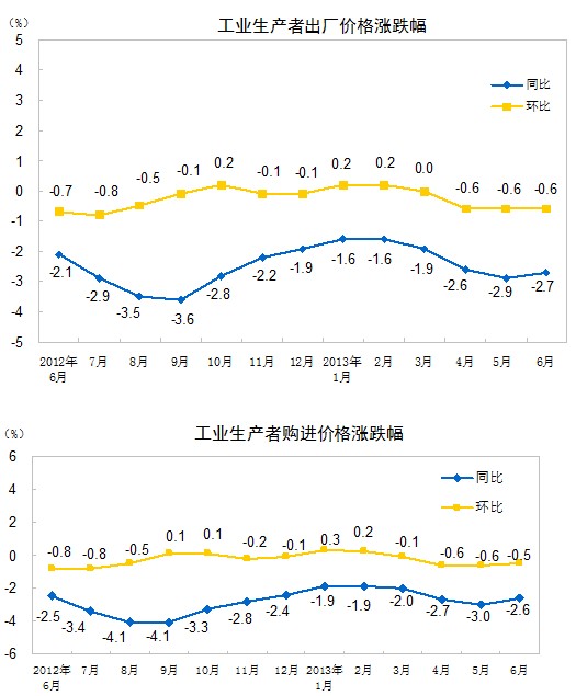2013年6月份,全國(guó)工業(yè)生產(chǎn)者出廠價(jià)格同比下降2.7%,環(huán)比下降0.6%。工業(yè)生產(chǎn)者購(gòu)進(jìn)價(jià)格同比下降2.6%,環(huán)比下降0.5%。上半年,工業(yè)生產(chǎn)者出廠價(jià)格同比下降2.2%,工業(yè)生產(chǎn)者購(gòu)進(jìn)價(jià)格同比下降2.4%。
