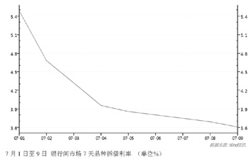 7月以來(lái),6月底的“錢(qián)荒”已經(jīng)趨于平穩(wěn),市場(chǎng)也度過(guò)了7月5日的補(bǔ)繳存款準(zhǔn)備金的“關(guān)卡”。7月9日,上海銀行間同業(yè)拆放利率(Shibor)顯示,各期限利率全線小幅下跌,短期利率中,隔夜利率下跌0.7個(gè)基點(diǎn),至3.249%;7天期利率下跌6個(gè)基點(diǎn),至3.596%。中長(zhǎng)期利率中,3月期利率下跌7.1個(gè)基點(diǎn),至4.723%。