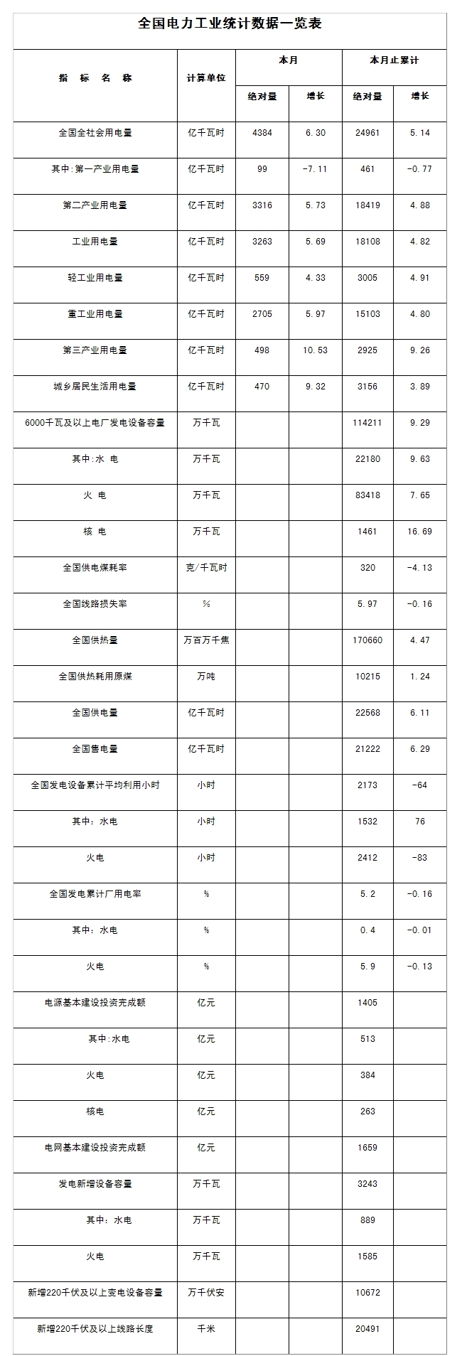 6月份,全社會用電量4384億千瓦時,同比增長6.3%。