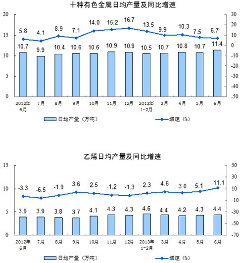 分產(chǎn)品看,6月份,464種產(chǎn)品中有310種產(chǎn)品同比增長(zhǎng)。其中,發(fā)電量4253億千瓦時(shí),同比增長(zhǎng)6.0%;鋼材9084萬(wàn)噸,增長(zhǎng)7.2%;水泥22754萬(wàn)噸,增長(zhǎng)8.8%;原油加工量3960萬(wàn)噸,增長(zhǎng)10.8%;十種有色金屬343萬(wàn)噸,增長(zhǎng)6.7%;乙烯132萬(wàn)噸,增長(zhǎng)11.1%;汽車185.2萬(wàn)輛,增長(zhǎng)13.5%;轎車103.7萬(wàn)輛,增長(zhǎng)13.1%。