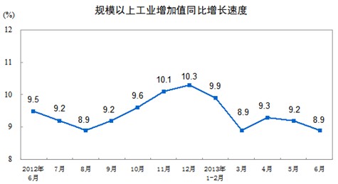 2013年6月份,規(guī)模以上工業(yè)增加值同比實(shí)際增長(zhǎng)8.9