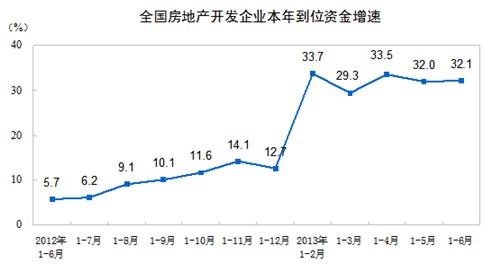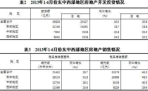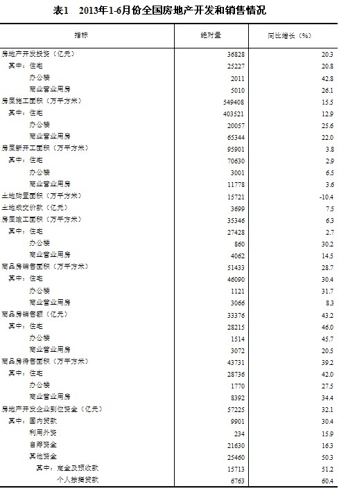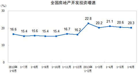 2013年1-6月份,全國房地產(chǎn)開發(fā)投資36828億元,同比名義增長20.3%(扣除價格因素實際增長20.3%),增速比1-5月份回落0.3個百分點。其中,住宅投資25227億元,增長20.8%,增速回落0.8個百分點,占房地產(chǎn)開發(fā)投資的比重為68.5%。