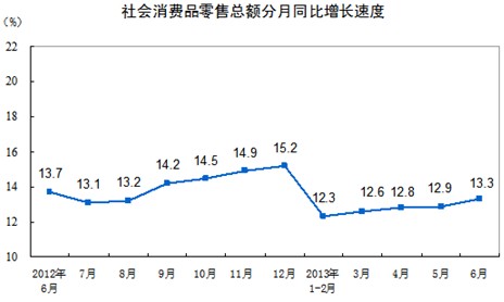 2013年6月份,社會(huì)消費(fèi)品零售總額18827億元,同比名義增長(zhǎng)13.3%(扣除價(jià)格因素實(shí)際增長(zhǎng)11.7%,以下除特殊說(shuō)明外均為名義增長(zhǎng))。其中,限額以上企業(yè)(單位)消費(fèi)品零售額9764億元,增長(zhǎng)11.5%。1-6月份,社會(huì)消費(fèi)品零售總額110764億元,同比增長(zhǎng)12.7%。