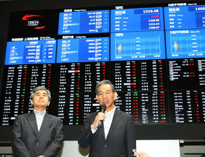 7月16日,在日本東京證券交易所,東京證券交易所社長(zhǎng)青田暸(右)宣布與大阪證券交易所合并股票現(xiàn)貨交易。 兩大證券交易所合并后,東京證券交易所上市公司數(shù)量、股票市值和交易金額均列世界第三位。