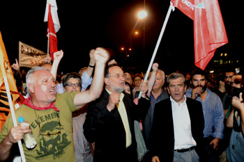 7月17日晚,在希臘雅典市中心的憲法廣場(chǎng),示威者呼喊口號(hào),抗議政府?dāng)M推行的新一輪緊縮措施。