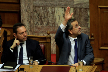 希臘總理薩馬拉斯(右)在議會(huì)投票上舉手投票。
