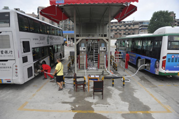 7月16日,公交車在加氣點內(nèi)加氣。 截至目前,貴陽公交集團公司已完成全部在用車的燃料清潔化工作,實現(xiàn)了“清潔公交”目標,使貴陽成為全國在公共交通領(lǐng)域使用清潔燃料最多的城市。記者