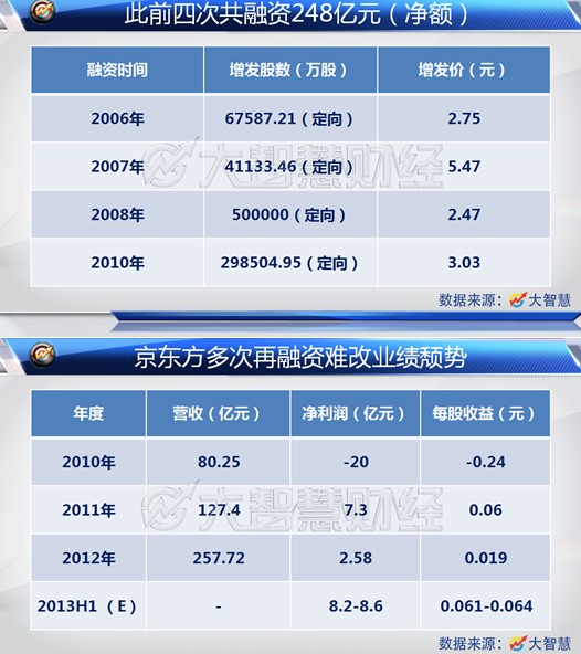 翻閱京東方A近3年財(cái)報(bào)數(shù)據(jù)發(fā)現(xiàn),2010年公司營(yíng)收80.25億,凈利潤(rùn)卻是負(fù)20億;2011年?duì)I收127.4億,凈利潤(rùn)7.3億元;2012年?duì)I收257.72億元,凈利潤(rùn)2.58億元。每次當(dāng)公司岌岌可危、頻臨退市邊緣,就會(huì)拋出定增、重組等方案。06到08年間京東方連續(xù)三年定增,從股市中不斷抽血。但在每次融資之后,公司經(jīng)營(yíng)狀況卻不見(jiàn)好轉(zhuǎn)。為何巨額投資只帶來(lái)這點(diǎn)利潤(rùn)?