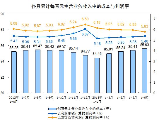 1-6月份,規(guī)模以上工業(yè)企業(yè)實(shí)現(xiàn)主營(yíng)業(yè)務(wù)收入478365.4億元,比去年同期增長(zhǎng)11.4%。每百元主營(yíng)業(yè)務(wù)收入中的成本為85.63元,以利潤(rùn)總額計(jì)算的利潤(rùn)率為5.4%,以主營(yíng)活動(dòng)利潤(rùn)計(jì)算的利潤(rùn)率為5.83%。