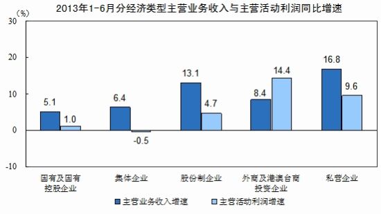 1-6月份,在規(guī)模以上工業(yè)企業(yè)中,國(guó)有及國(guó)有控股企業(yè)實(shí)現(xiàn)利潤(rùn)總額7287.7億元,比去年同期增長(zhǎng)4.8%,其中,主營(yíng)活動(dòng)利潤(rùn)6426.7億元,比去年同期增長(zhǎng)1%;集體企業(yè)實(shí)現(xiàn)利潤(rùn)總額368億元,增長(zhǎng)1.2%,其中,主營(yíng)活動(dòng)利潤(rùn)433.4億元,下降0.5%;股份制企業(yè)實(shí)現(xiàn)利潤(rùn)總額15091.2億元,增長(zhǎng)9.1%,其中,主營(yíng)活動(dòng)利潤(rùn)16526.2億元,增長(zhǎng)4.7%;外商及港澳臺(tái)商投資企業(yè)實(shí)現(xiàn)利潤(rùn)總額5983.9億元,增長(zhǎng)14.8%,其中,主營(yíng)活動(dòng)利潤(rùn)5964.8億元,增長(zhǎng)14.4%;私營(yíng)企業(yè)實(shí)現(xiàn)利潤(rùn)總額7999.4億元,增長(zhǎng)15.8%,其中,主營(yíng)活動(dòng)利潤(rùn)10134.9億元,增長(zhǎng)9.6%。