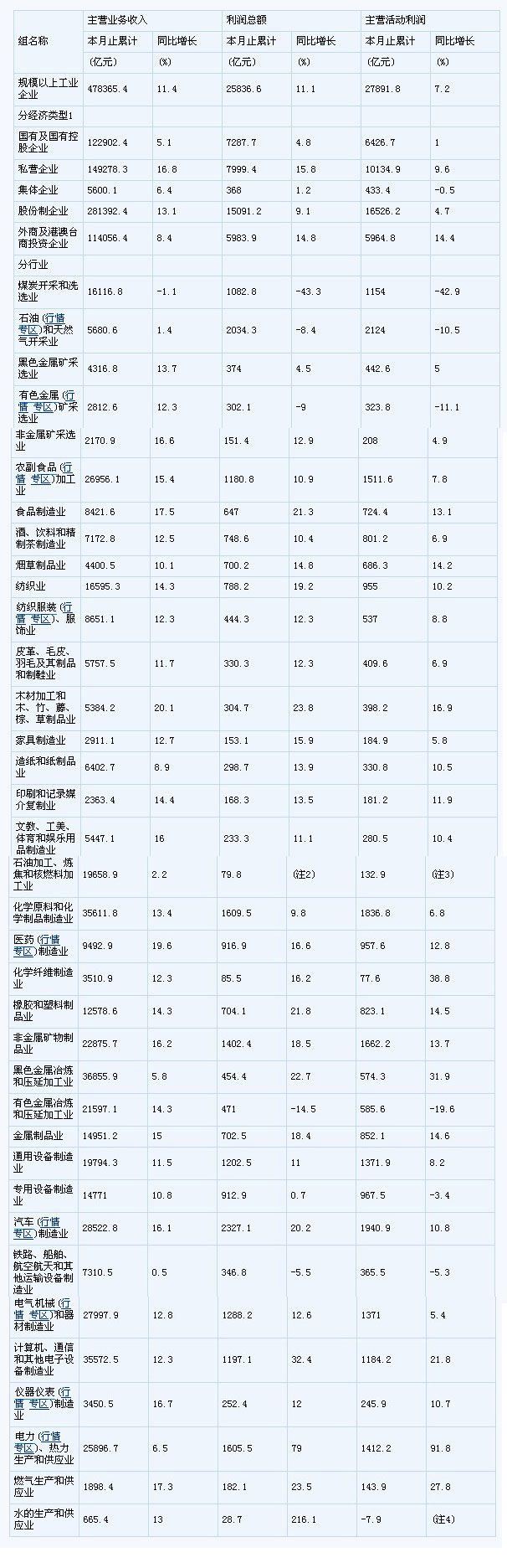 (注:從2013年5月起,在利潤(rùn)總額下增加“主營(yíng)活動(dòng)利潤(rùn)”指標(biāo),主營(yíng)活動(dòng)利潤(rùn)=主營(yíng)業(yè)務(wù)收入-主營(yíng)業(yè)務(wù)成本-主營(yíng)業(yè)務(wù)稅金及附加-銷售費(fèi)用-管理費(fèi)用-財(cái)務(wù)費(fèi)用。主營(yíng)活動(dòng)利潤(rùn)指標(biāo)和工業(yè)生產(chǎn)的關(guān)系更加密切,可以更好地反映企業(yè)進(jìn)行工業(yè)生產(chǎn)活動(dòng)的經(jīng)營(yíng)成果。)
