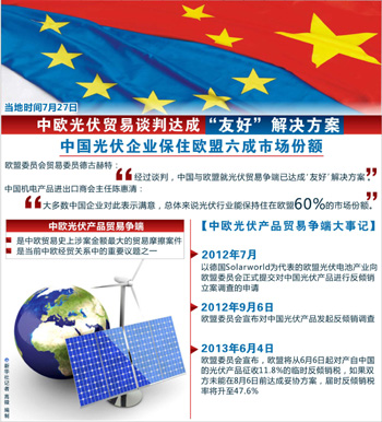 隨即,商務(wù)部網(wǎng)站發(fā)表了商務(wù)部新聞發(fā)言人沈丹陽的談話,對中歐達(dá)成價格承諾安排表示贊賞和歡迎。歐委會貿(mào)易委員德古赫特也于當(dāng)?shù)貢r間27日在布魯塞爾宣布了這一消息,他說,經(jīng)過數(shù)周緊張談判,中歐就光伏爭端已達(dá)成“友好”解決方案,歐盟很高興取得一份滿意的有關(guān)中國輸歐光伏產(chǎn)品的價格協(xié)議。