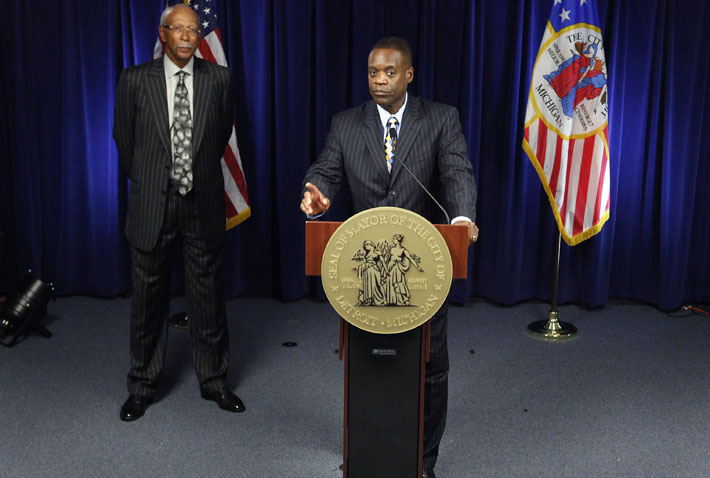 7月18日,美國底特律緊急財政管理人凱文·奧爾(右)在底特律出席新聞發(fā)布會。奧爾當(dāng)天獲密歇根州州長里克·斯奈德授權(quán),向位于底特律的美國破產(chǎn)法院遞交破產(chǎn)申請。新華社/美聯(lián)