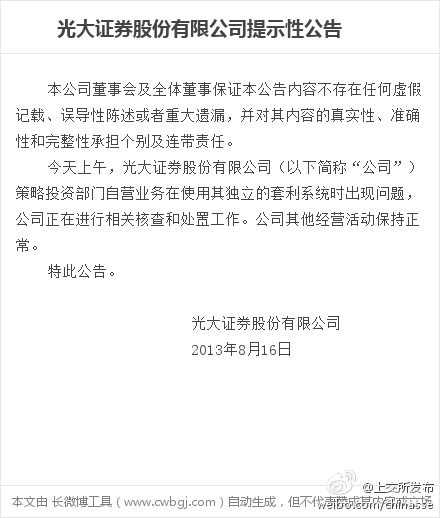 不過14:22上交所官方微博轉(zhuǎn)發(fā)的光大證券股份有限公司提示性公告中稱:“今天上午,光大證券股份有限公司策略投資部門自營業(yè)務(wù)在使用其獨(dú)立的套利系統(tǒng)時出現(xiàn)問題,公司正在進(jìn)行相關(guān)核查和處置工作。”據(jù)媒體報(bào)道,上海交易所已聯(lián)系上光大,暴漲是光大系統(tǒng)問題,他們技術(shù)人員在查,但還沒查出原因。