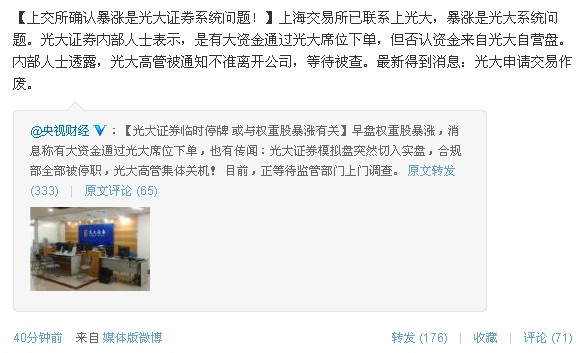 據(jù)央視財(cái)經(jīng)微博最新報(bào)道,光大已申請交易作廢。