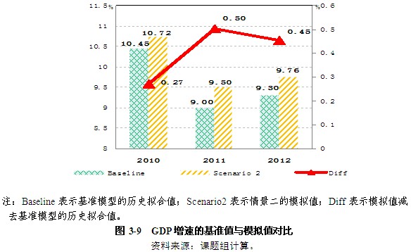 首先,降低非稅收入占比并把減少的非稅收入用于提高居民的工資收入,相對于基準(zhǔn)模型的歷史擬合值,在2010-2012年期間,GDP增速可以分別提高0.27、0.50和0.45個百分點。同時,產(chǎn)缺口分別降低0.24、0.70和1.13個百分點,產(chǎn)能過剩的局面出現(xiàn)改觀(圖3-9)。