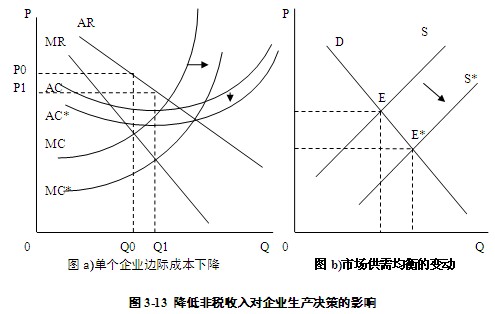 (1)現(xiàn)有的模型技術(shù)尚無法模擬降低對(duì)企業(yè)的非稅征收所導(dǎo)致的企業(yè)生產(chǎn)成本下降所引起的變化:由于企業(yè)的非稅負(fù)擔(dān)下降,企業(yè)的邊際成本下降,將推動(dòng)企業(yè)生產(chǎn)擴(kuò)張。在既定需求下,市場(chǎng)總供給將增加,產(chǎn)品價(jià)格將下降,企業(yè)利潤(rùn)將上升,投資將增加,全社會(huì)的供需平衡點(diǎn)將向右下方移動(dòng),過剩的生產(chǎn)能力將得到更充分利用(圖3-13)。