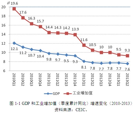 外部市場需求的萎縮以及近三年來過度投資所引發(fā)的產(chǎn)能過剩,使中國工業(yè)生產(chǎn)增速和國內(nèi)生產(chǎn)總值(GDP)增速雙雙持續(xù)下降(圖1-1)。工業(yè)增加值(季度累計)的增速從2010年第一季度的19.6%下降到2013年第二季度的9.3%;同期,GDP(季度累計)增速也從12.1%下降到7.6%,雙雙創(chuàng)下了近三年來的最低增長速度。