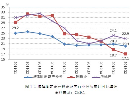 2013年上半年,城鎮(zhèn)固定資產(chǎn)投資累計增長20.1%,比上年同期小幅下降0.3個百分點。分行業(yè)看,上半年制造業(yè)投資累計增速為17.1%,比上年同期下降7.4個百分點,是近十年的最低增速;房地產(chǎn)業(yè)的投資累計增速為22.9%,比上年同期增加了0.8個百分點;交通運輸、倉儲及郵政業(yè)的投資累計增速為21.5%,比上年同期增加了23.5個百分點(圖1-2)。制造業(yè)投資累計增速的大幅下滑,是上半年實體經(jīng)濟減速的一個重要表現(xiàn),也同時反映了中國目前產(chǎn)能過剩的現(xiàn)實。