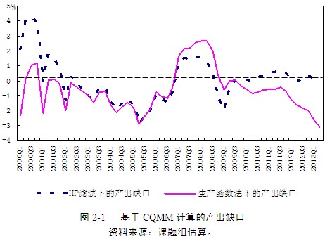 計算產(chǎn)出缺口的一種常用方法是利用H-P濾波計算實際產(chǎn)出與其趨勢(潛在產(chǎn)出)的缺口。圖2-1表明利用這種方法計算的產(chǎn)出缺口與現(xiàn)實存在著背離:近期中國經(jīng)濟的產(chǎn)出缺口是正的,意味著不存在產(chǎn)能過剩的情況。然而,根據(jù)拓展后的CQMM的估算結(jié)果表明,自2009年起,中國經(jīng)濟產(chǎn)出缺口就開始呈現(xiàn)出持續(xù)擴大的態(tài)勢。這說明,過去三四年期間應對金融危機而采用的擴張性政策導致中國經(jīng)濟不僅存在行業(yè)結(jié)構(gòu)上的產(chǎn)能過剩,而且還存在經(jīng)濟總量上的產(chǎn)能過剩。