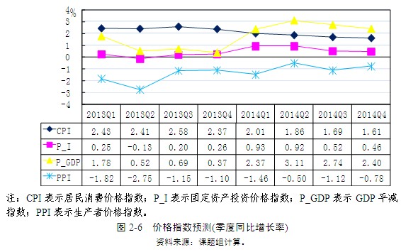2013年固定資產(chǎn)投資價格指數(shù)(P_I)預(yù)計為0.14%,比上年下降0.96個百分點;2014年P(guān)_I可能回升至0.71%的水平。同比分季度看,2013年第三季度可能達到0.20%,第四季度小幅上升到0.26%;2014年第一季度該指數(shù)可能繼續(xù)上升至0.93%,第二季度仍維持在0.92%,第三季度則下跌到0.52%,并于第四季度進一步下降至0.46%(圖2-6)。