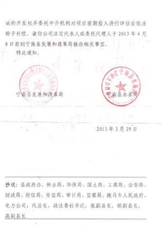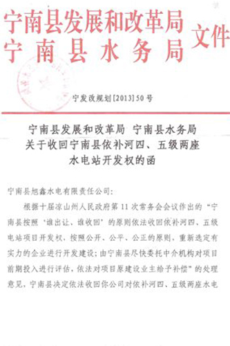 姚勇告訴記者,3月29日,寧南縣發(fā)改局、水務(wù)局所發(fā)出的寧發(fā)改規(guī)劃【2013】50號(hào)紅頭文件中“寧南縣決定依法收回你公司對(duì)依補(bǔ)河4、5級(jí)兩座水電站的開(kāi)發(fā)權(quán)并委托中介機(jī)構(gòu)對(duì)項(xiàng)目前期投入進(jìn)行評(píng)估后依法給予補(bǔ)償”,其意思僅僅是告訴旭鑫公司政府將收回4、5級(jí)電站開(kāi)發(fā)權(quán),發(fā)函僅僅是請(qǐng)公司過(guò)來(lái)商議,并沒(méi)有對(duì)公司進(jìn)行行政處罰和強(qiáng)制措施,縣發(fā)改局將在20日對(duì)是否收回4、5級(jí)電站舉行公開(kāi)聽(tīng)證。