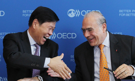 8月27日,在位于法國巴黎的經(jīng)濟合作與發(fā)展組織(經(jīng)合組織)總部,中國國家稅務總局局長王軍代表中國政府簽署《多邊稅收征管互助公約》,中國由此成為該公約第56個簽約方,為加強國際稅收合作、擴大國際稅收征收網(wǎng)絡和提高對跨境納稅人的稅收征管與服務水平邁出堅實一步。 圖為王軍(左)與經(jīng)合組織秘書長安赫爾·古里亞在簽約儀式上握手。