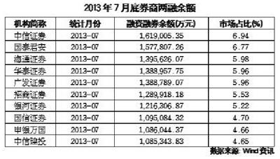 WIND統(tǒng)計數(shù)據(jù)顯示,截至今年7月末,從兩融余額來看,市場份額占據(jù)前十的分別為中信證券、國泰君安、海通證券、華泰證券、廣發(fā)證券、招商證券、銀河證券、國信證券、申銀萬國和中信建投。盡管同為上市券商,東吳證券、國海證券等區(qū)域性券商的市場份額均在1%以下。一位券商業(yè)人士對記者表示,目前證券公司的創(chuàng)新業(yè)務包括兩融、約定回購等都對資本金消耗量較大,券商核心指標凈資本的規(guī)模一定程度上決定了券商創(chuàng)新業(yè)務開展的空間。這也是大券商在這些業(yè)務上占據(jù)優(yōu)勢的主要原因。如果不能實現(xiàn)差異化競爭,一些區(qū)域性的中小券商恐怕難逃被兼并的下場!114家券商,減一半還嫌多!彼f。