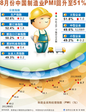 中國物流與采購聯(lián)合會、國家統(tǒng)計(jì)局服務(wù)業(yè)調(diào)查中心9月1日發(fā)布,2013年8月份中國制造業(yè)采購經(jīng)理指數(shù)(PMI)為51%,比上月上升0.7個百分點(diǎn),連續(xù)第11個月擴(kuò)張并創(chuàng)下年內(nèi)新高。