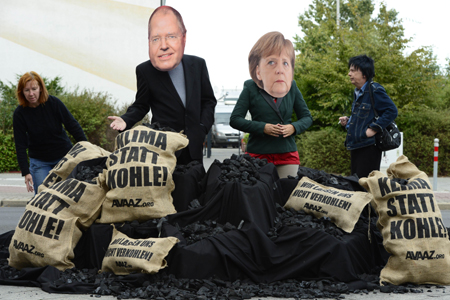9月1日,在德國柏林大選電視辯論場外,抗議者戴著德國總理默克爾與反對黨社民黨總理候選人施泰因布呂克的面具。默克爾與施泰因布呂克主要圍繞最低工資制、稅收政策、幼兒看護政策、養(yǎng)老和醫(yī)療保險、能源轉(zhuǎn)型、希臘債務(wù)以及敘利亞局勢等話題展開。特別是德國一再對南歐小國希臘的援助,讓德國人有些不耐煩,反對黨一直指責(zé)政府隱瞞希臘債務(wù)風(fēng)險的真相。民調(diào)顯示,施泰因布呂克在整場辯論中略占上風(fēng)。