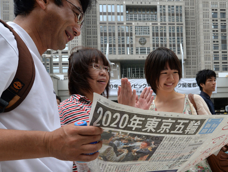 8日,日本民眾在東京都政府大樓門前閱讀日本媒體為東京成功申辦2020年奧運(yùn)會(huì)印刷的號外。阿根廷布宜諾斯艾利斯時(shí)間7日晚,在國際奧委會(huì)第125次全會(huì)上,經(jīng)過兩輪投票和近一個(gè)半小時(shí)的等待,東京最終獲得主辦權(quán)。日本首相安倍晉三在隨后舉行的新聞發(fā)布會(huì)上表示,舉辦奧運(yùn)會(huì)無疑有助于日本經(jīng)濟(jì)持續(xù)增長。有報(bào)告預(yù)測,2020年東京奧運(yùn)會(huì)可能幫助日本國內(nèi)生產(chǎn)總值(GDP)增長4.2萬億日元(約423.9億美元)。