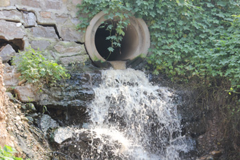 更為嚴(yán)重的是,在當(dāng)?shù)匾晃淮迕竦膸椭,記者發(fā)現(xiàn)滲坑北部邊緣有一條暗埋的管道,而這個(gè)滲坑內(nèi)紅褐色的污水正在順著這條管道排放到位于西北角(臨近公路)的地面,并形成一條小溝彎彎曲曲流向距離西邊百米左右的玉符河里!