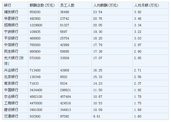 通過(guò)統(tǒng)計(jì)各上市銀行半年報(bào)中員工費(fèi)用指標(biāo),結(jié)果顯示,國(guó)有五大銀行人均月薪排名墊底,均低于2萬(wàn)元,而另外8家全國(guó)股份制商業(yè)銀行及3家城商行,人均薪酬均超過(guò)2萬(wàn)元。
