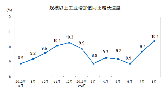 國家統(tǒng)計局10日公布數(shù)據(jù),2013年8月份,規(guī)模以上工業(yè)增加值同比實際增長10.4%(以下增加值增速均為扣除價格因素的實際增長率),比7月份加快0.7個百分點。從環(huán)比看,8月份,規(guī)模以上工業(yè)增加值比上月增長0.93%。1-8月,規(guī)模以上工業(yè)增加值同比增長9.5%。