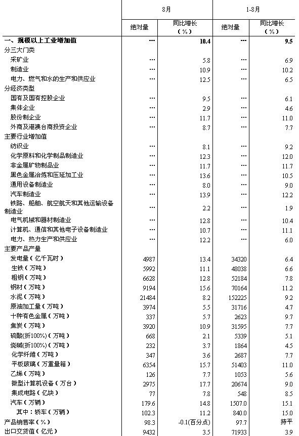 2013年8月份規(guī)模以上工業(yè)生產(chǎn)主要數(shù)據(jù)