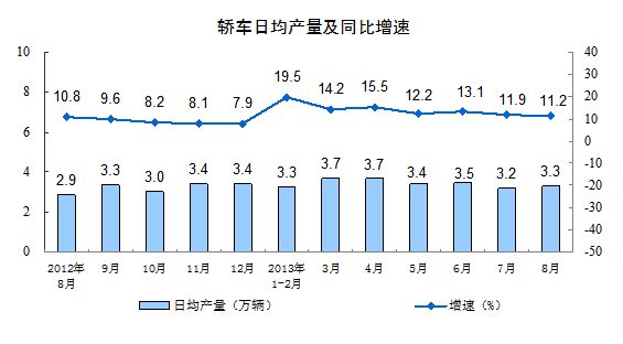 分產(chǎn)品看,8月份,464種產(chǎn)品中有305種產(chǎn)品同比增長。其中,發(fā)電量4987億千瓦時,同比增長13.4%;鋼材9194萬噸,增長15.6%;水泥21484萬噸,增長8.2%;原油加工量3974萬噸,增長5.5%;十種有色金屬337萬噸,增長5.7%;乙烯126萬噸,增長7.7%;汽車179.6萬輛,增長14.8%;轎車102.3萬輛,增長11.2%。