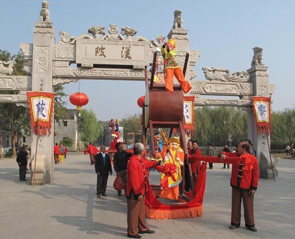 (五)民國(guó)以來(lái),渼陂臺(tái)輦出游又新增了舞龍、舞獅、花燈、花籃、彩龍船、蚌殼燈等燈彩表演,由原來(lái)數(shù)十人,增至450余人,僅樂(lè)隊(duì)便有七堂。自清道光28代傳人梁道伸至今,代代相傳,年年舉辦。