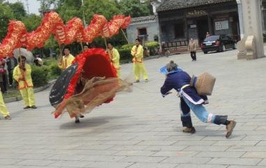 (四)到達(dá)陂頭“義倉(cāng)”廟前,駐步祭神。護(hù)架的執(zhí)事人焚香祝愿,神銃再響,鑼鼓齊奏,族長(zhǎng)三叩九禮,接過(guò)“神筒”,邊滾錫筒邊大聲唱贊:“一柱擎天,政通人和;二龍戲珠,人臻五福;三陽(yáng)開(kāi)泰,吉星高照;四季發(fā)財(cái),物阜民豐;五子登科,鵬程萬(wàn)里;六六大順,心想事成;七星拱照,瑞氣祥云;八方進(jìn)寶,財(cái)源滾滾;九九歸一,華夏生輝;十全十美,地久天長(zhǎng)。”贊詞在音樂(lè)聲中念畢,炮聲震地。鼓樂(lè)齊奏、煙霧彌空,嗩吶長(zhǎng)鳴,歡慶著新年五谷豐登,國(guó)泰民安。