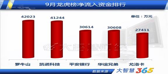 9月龍虎榜中,資金凈流入的前5個股分別是羅牛山、凱諾科技、平安銀行、華誼兄弟以及尤洛卡。在機構(gòu)及游資的追捧下,這五只個股也表現(xiàn)不俗。其中羅牛山是土改概念股,華誼兄弟是文化傳媒股。十八屆三中全會上極有可能出臺土改政策利好,而文化傳媒板塊既有政策扶持,又有優(yōu)秀的業(yè)績支撐,這兩個板塊成為資金追逐的熱點在情理之中。凱諾科技為重組概念,重組概念股一貫就是市場青睞的對象。