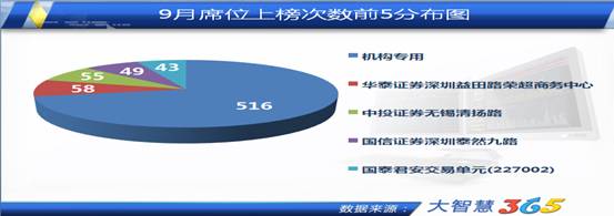 9月龍虎榜中最活躍的5家席位分別是機構(gòu)專用席位、華泰證券深圳益田路榮超商務(wù)中心、中投證券無錫清揚路營業(yè)部、國信證券深圳泰然九路營業(yè)部和國泰君安交易單元(227002)。機構(gòu)專用席位共上榜了516次,華泰證券深圳益田路榮超商務(wù)中心營業(yè)部上榜58次,中投無錫清揚路營業(yè)部上榜55次,國信證券深圳泰然九路營業(yè)部上榜49次,國泰君安交易單元(227002)上榜43次。在8月的龍虎榜中,中投無錫清揚路營業(yè)部、機構(gòu)專用席位也登上了上榜次數(shù)前5排名。大智慧投資顧問余磊表示,投資者可以重點跟蹤這幾家席位的買賣情況。